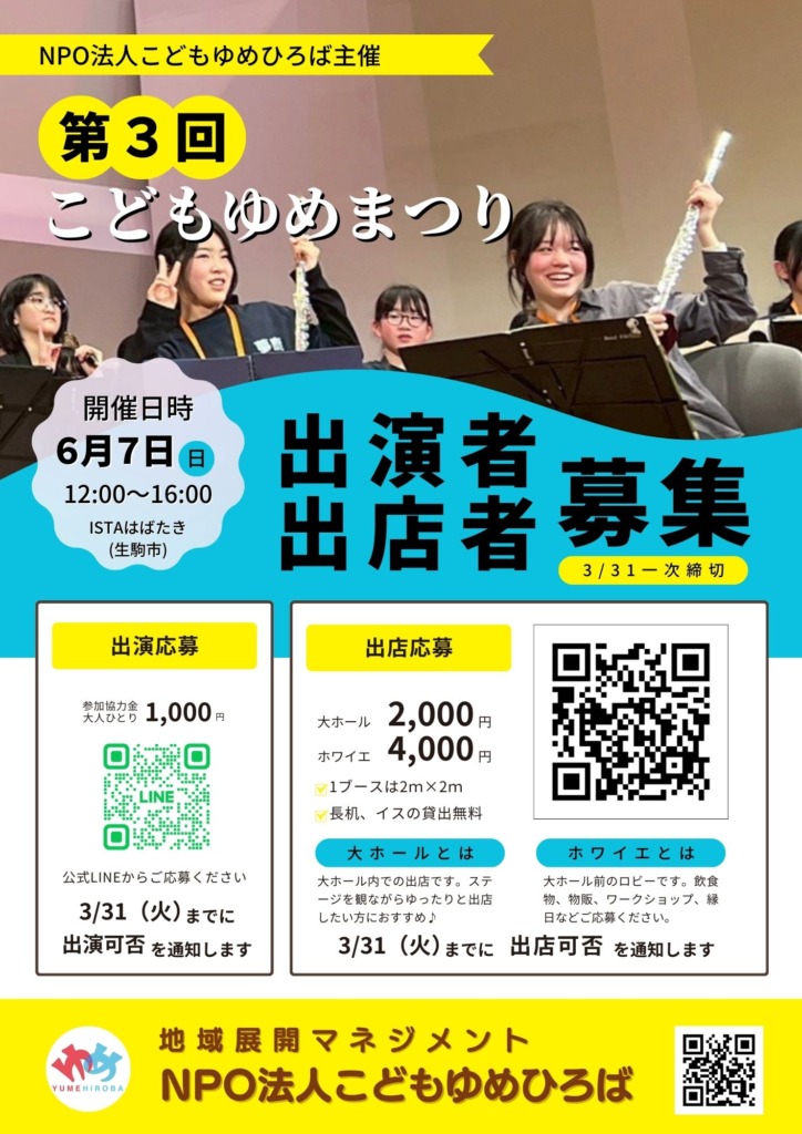 | 出演申込 | 公式LINEよりご応募ください 【6月7日ゆめまつり出演応募】 1.ジャンル 2.出演者の年齢ごとの人数(小学生以下○名、中学生○名、大人○名など) 3月31日までに出演可否を連絡します。 【出演料】 高校生以下が過半数の団体は無料(大人は1人1000円ご協力ください) |