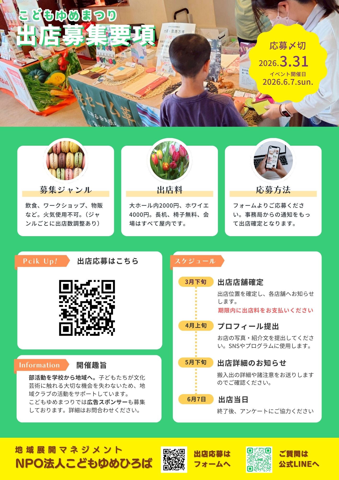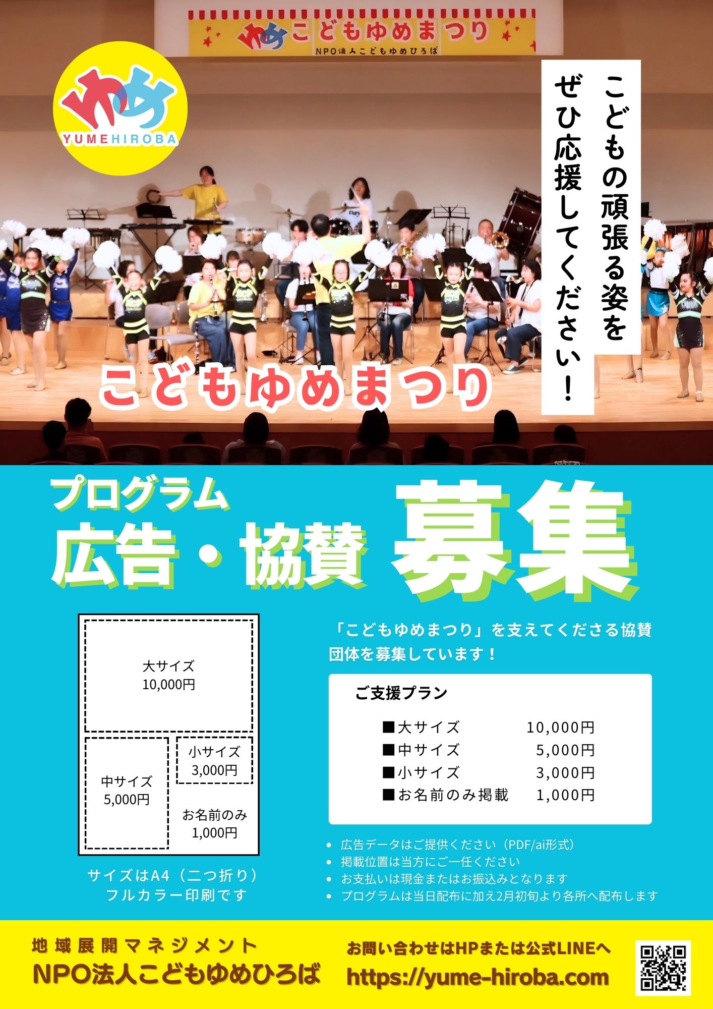 | 募集内容 | こどもゆめまつりパンフレットへの企業等広告、協賛氏名掲載 |