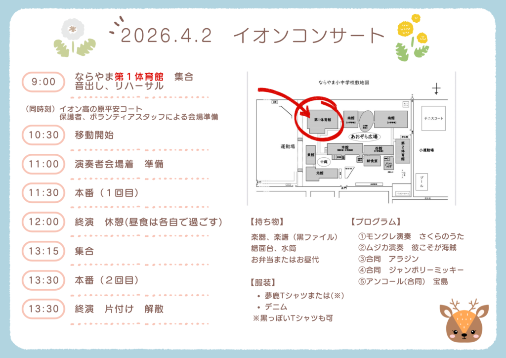 音出し・リハーサル(体育館シューズ、スリッパ等お持ちください)