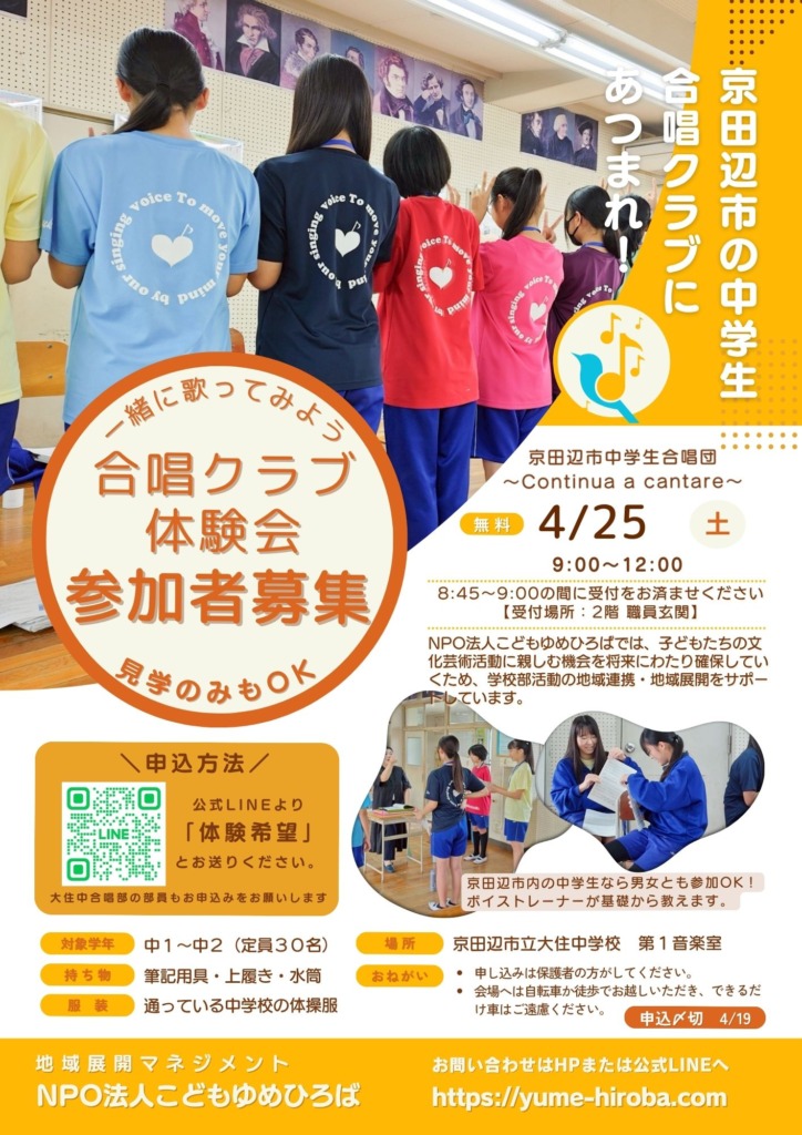 京田辺市の中学生のみなさん、一緒にハーモニーを楽しみませんか? 「京田辺市中学生合唱団 ~Continua a cantare~」では、新しい仲間を募集するための合唱クラブ体験会を開催します!