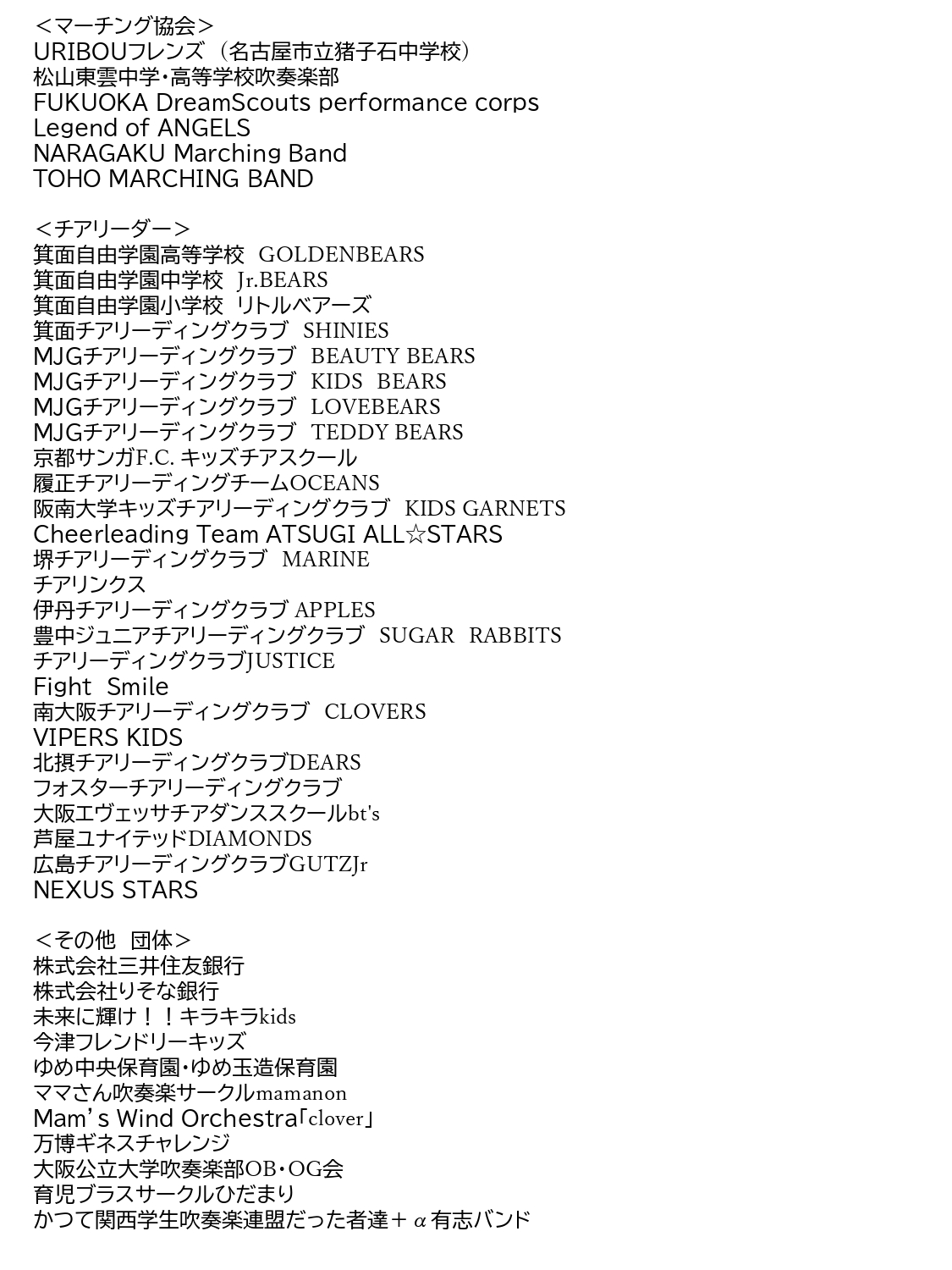 | ギネスチャレンジ 8:20 リハーサル(8分間) 8:40 ギネス世界記録 チャレンジ本番 行進:「星条旗よ永遠なれ」116のマーチテンポ 3回~4回演奏します。 3回目の演奏で400m以上行進できていた場合には演奏終了。万が一400mに達しない場合には、4回目を行う指示が「アナウンスとフリップボード」であります。 立奏:「ふるさと」テンポ:80 カスタネット・ポンポンの方もパフォーマンスを行ってください。 9:00 ギネス終了 移動 | |