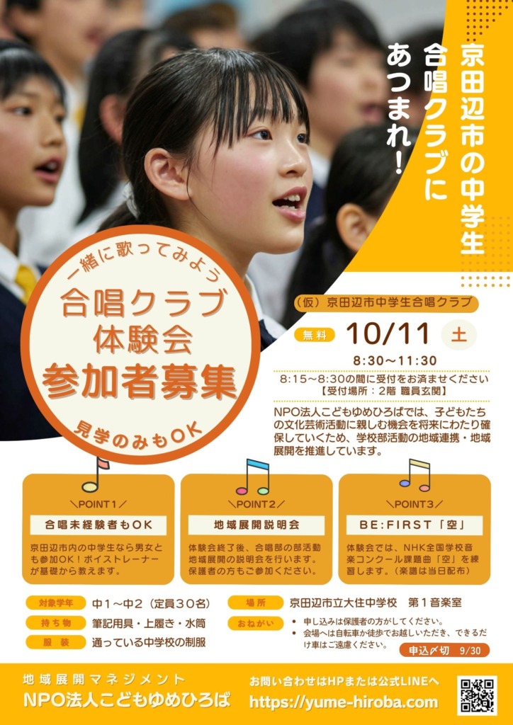 2025年10月より「(仮)京田辺市中学生合唱クラブ」の活動が始まります。京田辺市内の中学生(1・2年)なら誰でも参加可能です。