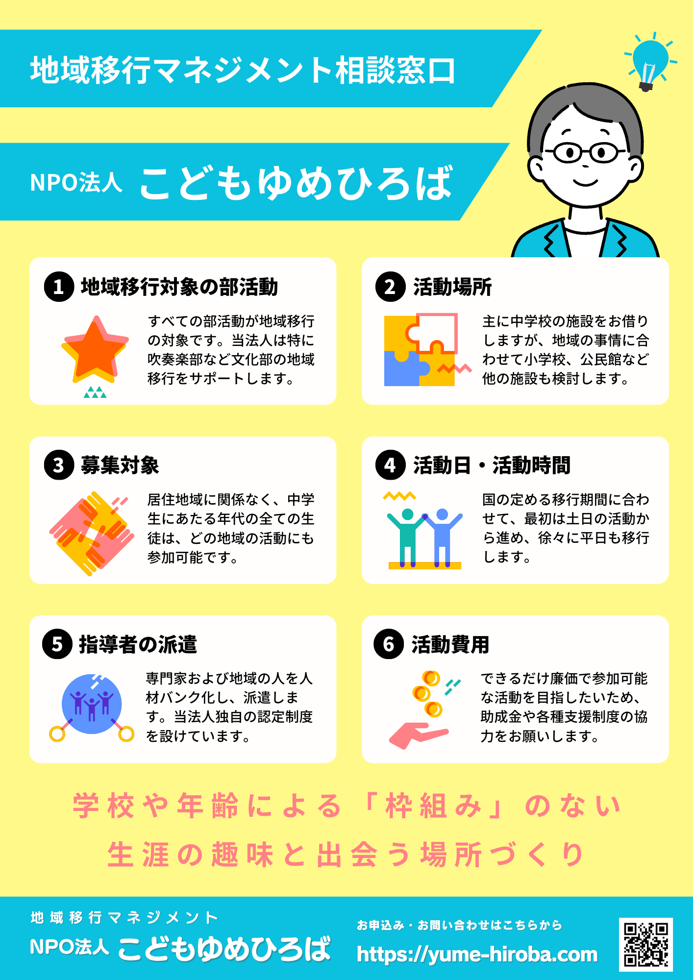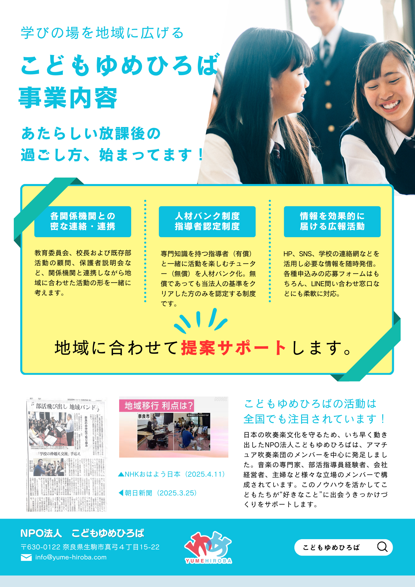 こどもゆめひろば とは 音と食でつながる地域コミュニティ「こどもゆめひろば」 学校部活動の制度変更(部活動の地域移行・地域展開)に伴うお困りごと全般をサポートしています。部活動という枠組みにとらわれず、こどもたちが音楽、芸術、スポーツを仲間とともに思いっきり楽しめる環境を目指して、一緒に考えましょう。 行政、自治体からの相談 学校単位での相談 既存の地域クラブ、地域クラブ立上げの相談 保護者、生徒からの相談 事業内容 お問い合わせはこちら